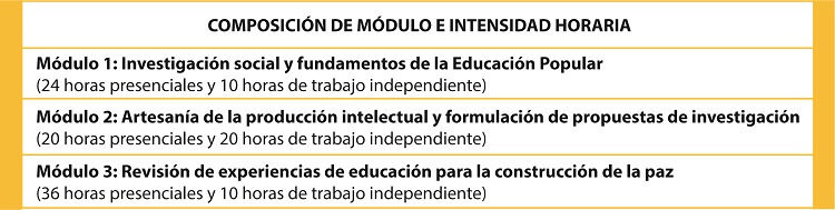 ObjetivoFortalecer en los participantes las capacidades de investigación e intervención en el campo de la educación popular, para el análisis de experiencias en torno a la construcción de paz y la elaboración de propuestas que permitan el mejoramiento, la ampliación y/o la réplica de las mismas.