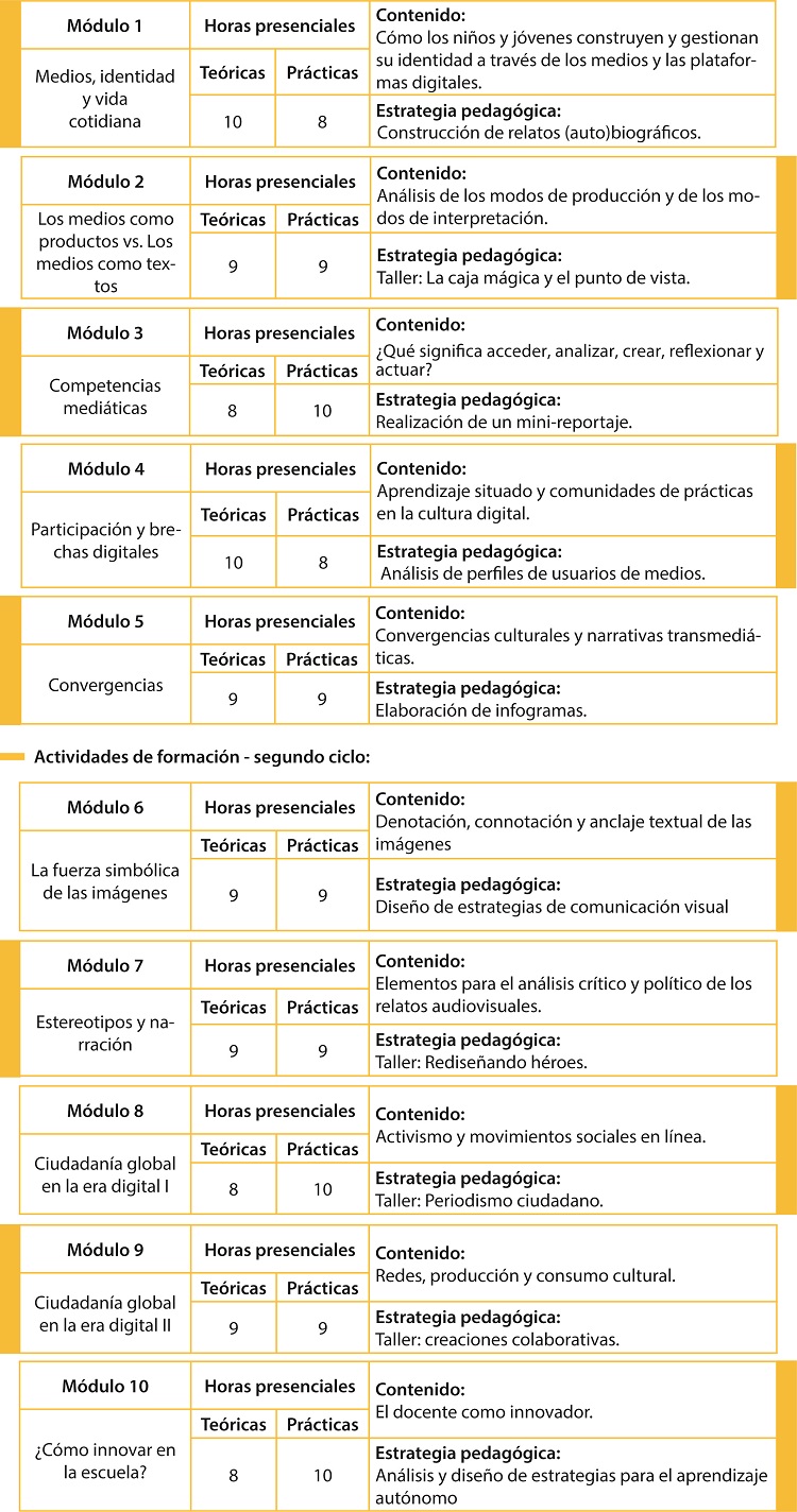 Estructura curricularLa metodología del programa contempla diferentes sesiones teórico-prácticas compuestas por: presentación y esclarecimiento de conceptos, grupos de discusión, estudios de caso y talleres de realización de piezas comunicativas y producción mediática. Se abordarán, en clave de reflexiones pedagógicas, las distintas maneras en las que la “mediación” ocurre o puede ocurrir dentro del aula.