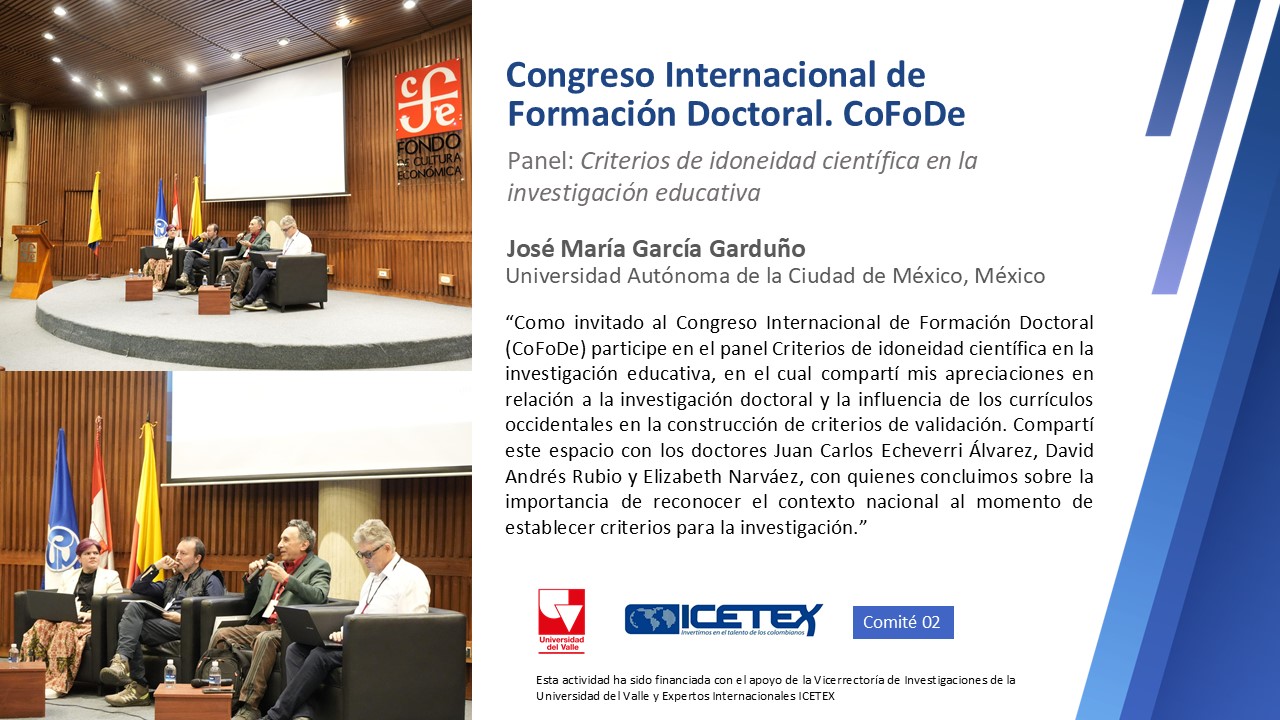 Desde la Facultad de Educación y Pedagogía de la Universidad del Valle, expresamos nuestro agradecimiento por la valiosa presencia del profesor García en este importante encuentro académico. Asimismo, reconocemos el respaldo de la convocatoria Expertos Internacionales del ICETEX, que hizo posible su participación en el congreso.