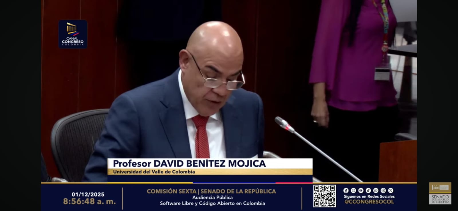 El profesor David Benítez Mojica, Profesor de la Universidad del Valle, adscrito a la Facultad de Educación y Pedagogía, fue invitado por la Comisión Sexta del Senado de la República a participar como experto académico en la línea de tecnologías digitales en educación en la Audiencia Pública sobre el Proyecto de Ley 220 de 2025, iniciativa que busca promover el uso de software libre y de código abierto en las entidades públicas del país.
