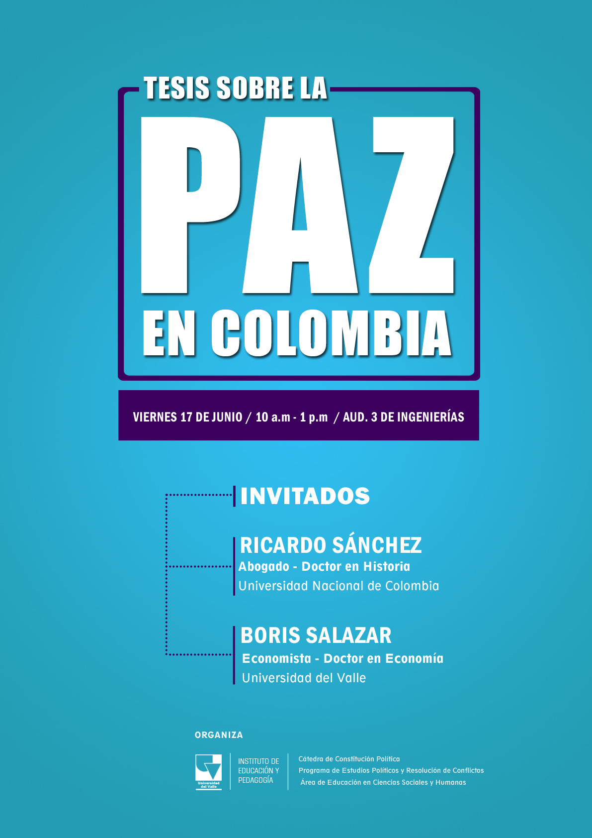 El Instituto de Educación y Pedagogía de la Universidad del Valle se permite invitarlos al conversatorio titulado "Tesis sobre la Paz en Colombia". Este evento tendrá lugar el próximo viernes 17 de Junio de 10 a.m. a 1 p.m. en el auditorio 3 de Ingenierías del Campus Meléndez. La iniciativa es promovida desde la Cátedra de Constitución Política que lidera el Programa de Estudios Políticos y Resolución de Conflictos. Como ponentes estarán los profesores Ricardo Sánchez (Universidad Nacional de Colombia) y Boris Salazar (Universidad del Valle).