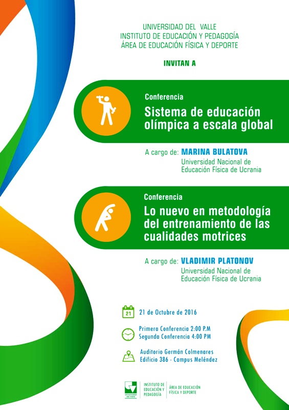 El Área de Educación Física y Deporte del Instituto de Educación Física y Deporte está invitando a las conferencias "Sistema de educación olímpica a escala global" dictada por Marina Bulatova y " Lo nuevo en metodología del entrenamiento de las cualidades motrices" dictada por Vladimir Platonov, ambos investigadores de la Universidad Nacional de Educación Física de Ucrania. Las conferencias serán dictadas en el Auditorio Germán Colmenares de 2:00 p.m. a 6:00 p.m. el 21 de octubre.