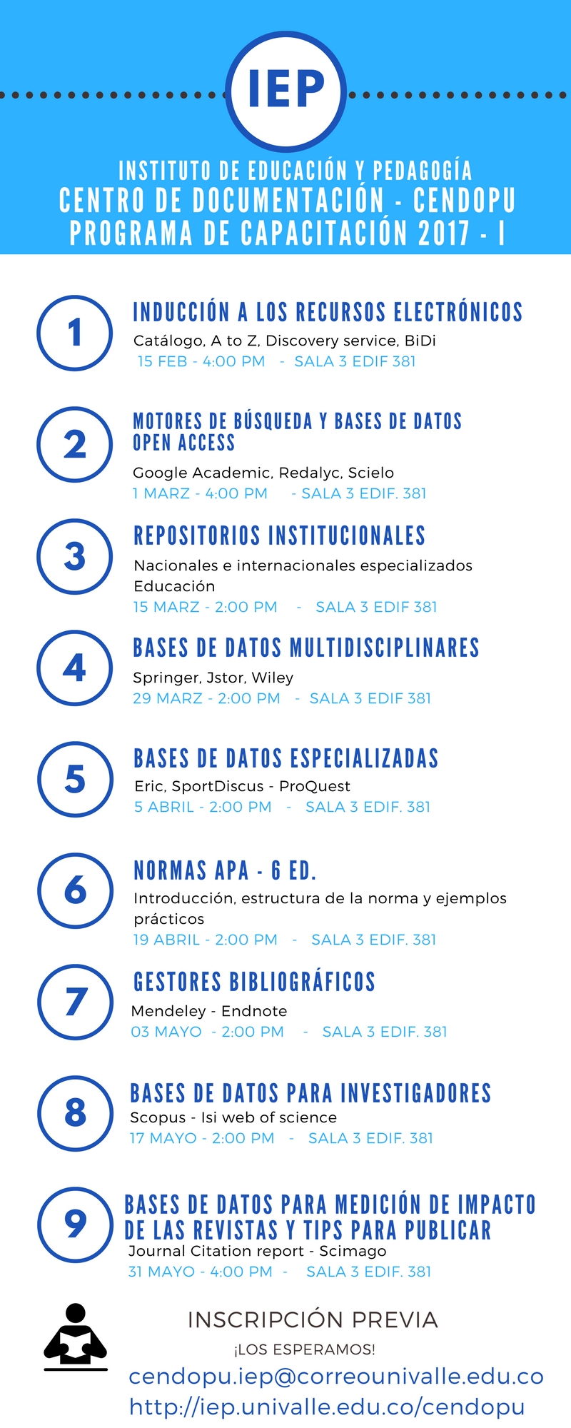 El Centro de Documentación del Instituto de Educación y Pedagogía - Cendopu- da a conocer a estudiantes y profesores su programa de capacitación para el uso de los recursos electrónicos con los que cuenta la Universidad del Valle. El ciclo arranca el 15 de febrero y se realizará en la sala 3 del edificio 381. Para inscribirse es necesario acercarse al punto de atención (Edificio 388 - primer piso) o enviar un correo electrónico a