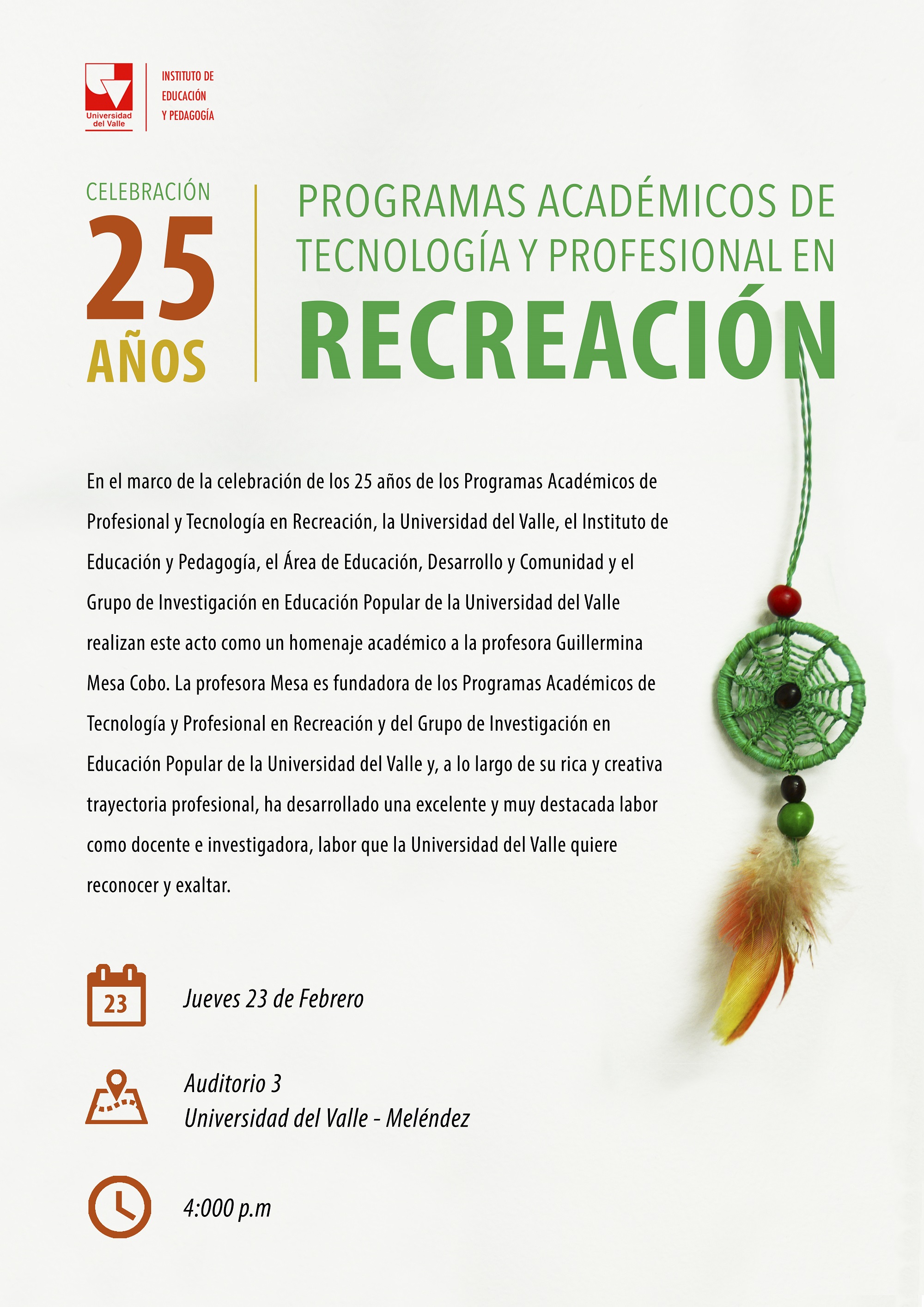 En el marco de la celebración de los 25 años de los Programas Académicos de Profesional y Tecnología en Recreación, la Universidad del Valle, el Instituto de Educación y Pedagogía, el Área de Educación, Desarrollo y Comunidad y el Grupo de Investigación en Educación Popular de la Universidad del Valle realizan este acto como un homenaje académico a la profesora Guillermina Mesa Cobo. La profesora Mesa es fundadora de los Programas Académicos de Tecnología y Profesional en Recreación y del Grupo de Investigación en Educación Popular de la Universidad del Valle y a lo largo de su rica y creativa trayectoria profesional ha desarrollado una excelente y muy destacada labor como docente e investigadora.Fecha: 23 de febrero