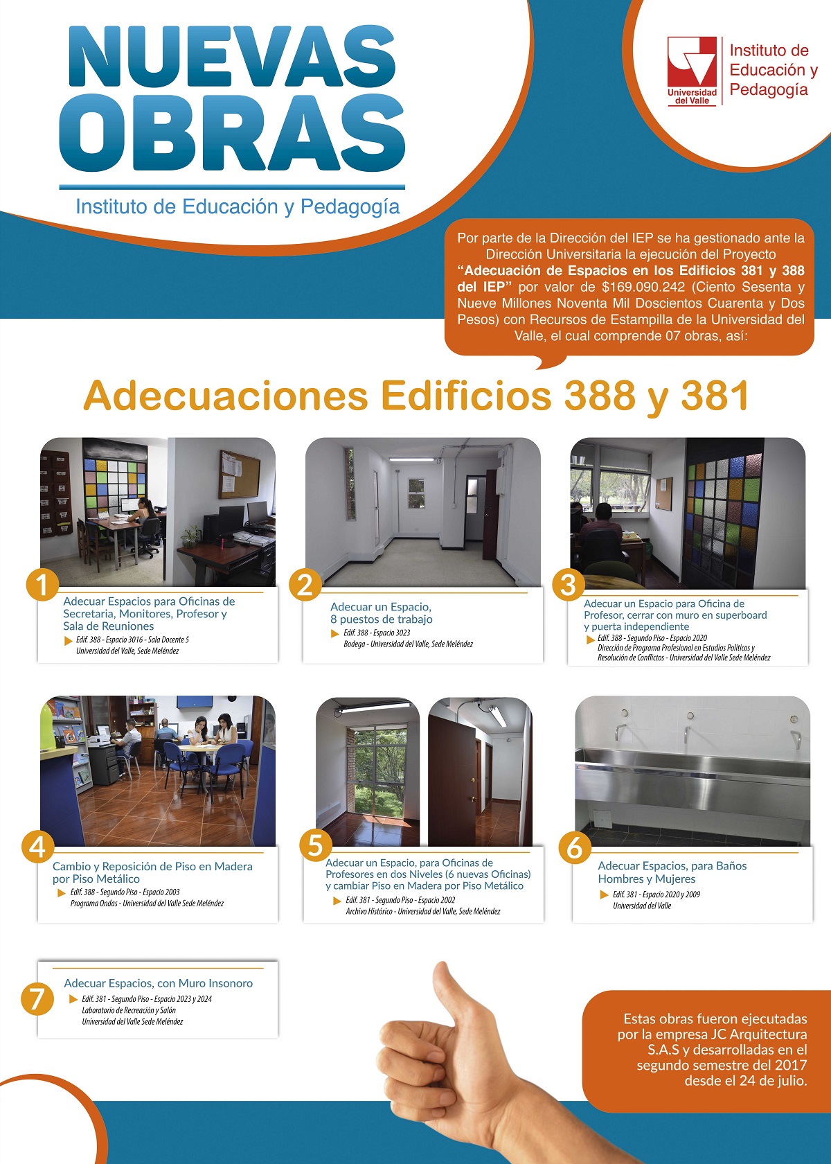 Por parte de la Dirección del Instituto de Educación y Pedagogía se ha gestionado ante la Dirección Universitaria la ejecución del Proyecto “Adecuación de Espacios en los Edificios 381 y 388 del IEP” por valor de $169.090.242 con Recursos de Estampilla de la Universidad del Valle, el cual comprende siete obras. Para la Dirección del IEP resulta satisfactorio mejorar las condiciones ambientales de profesores, estudiantes y empleados del IEP.