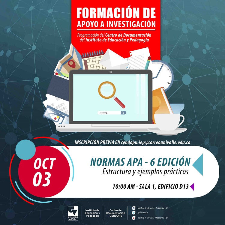 Este miércoles 3 de octubre el Centro de Documentación del Instituto de Educación y Pedagogía de la Universidad del Valle tendrá el taller en Normas APA, sexta edición 10:00 a.m. Sala 1 (primer piso) edificio D 13