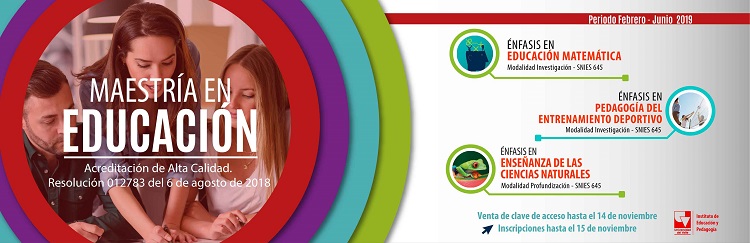 El Instituto de Educación y Pedagogía anuncia la apertura de las inscripciones a la Maestría en Educación en los énfasis de Educación Matemática, Enseñanza de las Ciencias Naturales y Pedagogía del Entrenamiento Deportivo, para el I periodo (Febrero - Junio de 2019). El proceso de inscripción va hasta el 14 de noviembre de 2018. Todos los detalles del proceso de inscripción en