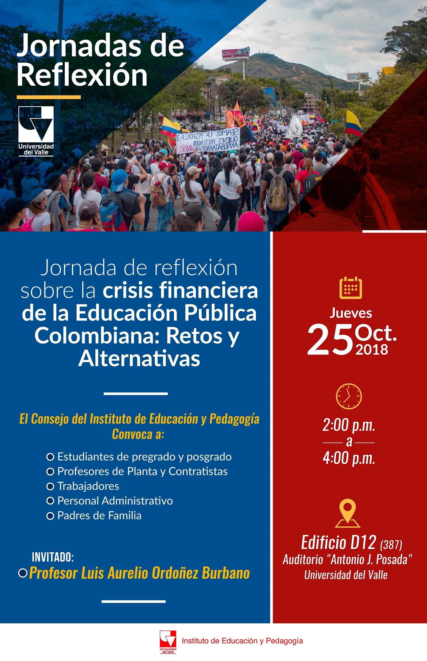 Están cordialmente invitados a la jornada de reflexión sobre la crisis financiera de la educación pública Colombiana: retos y alternativas. Esta jornada tendrá como invitado al profesor Luis Aurelio Ordoñez. La jornada está enmarcada en las actividades que desde el Consejo del IEP se promueven en pro de la consolidación de un escenario crítico y creativo que permita fortalecer una universidad pública, laica y de calidad.