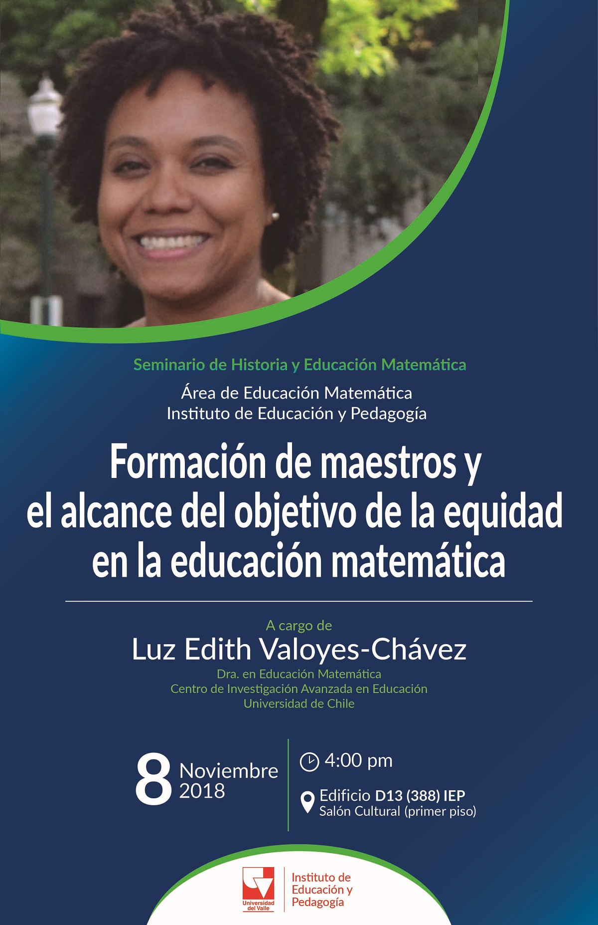 El Seminario de Historia y Educación Matemática del Área de Educación Matemática del Instituto de Educación y Pedagogía de la Universidad del Valle, invitan a la conferencia: "Formación de maestros y el alcance del objetivo de la equidad en la educación matemática" de la profesora Luz Edith Valoyes-Chávez. La actividad estará a cargo de la Doctora en Educación Matemática y miembro del Centro de Investigación Avanzada en Educación de la Universidad de Chile. La conferencia se realizará en el Salón Cultural del Edificio D13 (388), el 8 de noviembre de 2018, a las 4:00 p.m.