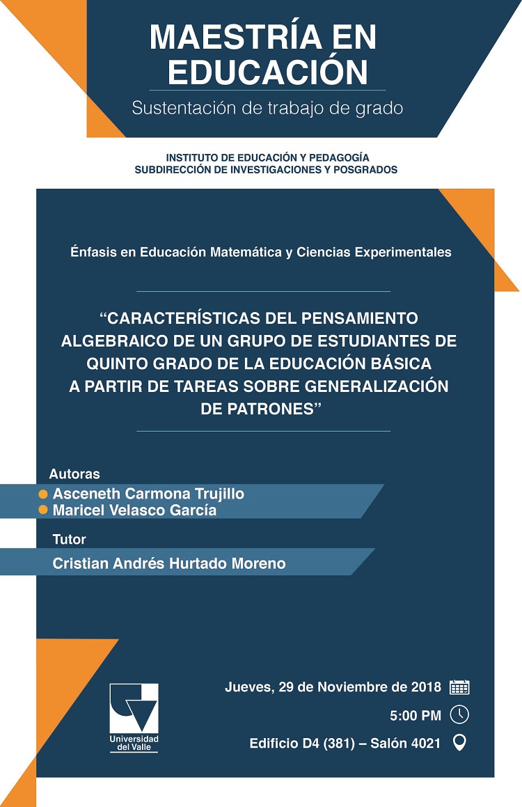 La Maestría en Educación del Instituto de Educación y Pedagogía, énfasis en educación matemática y ciencias experimentales, invita a la sustentación del trabajo de grado "Características del pensamiento algebraico de un grupo de estudiantes de quinto grado de la educación básica a partir de tareas sobre generalización de patrones". Las autoras son Asceneth Carmona Trujillo y Maricel Velasco García; el tutor, Cristian Andrés Hurtado Moreno.