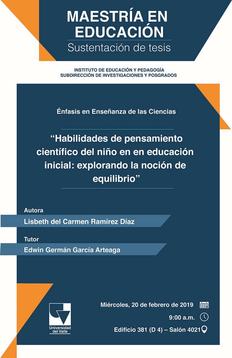 La Maestría en Educación del Instituto de Educación y Pedagogía, énfasis en enseñanza de las ciencias naturales, invita a la sustentación del trabajo de grado "Habilidades de pensamiento científico del niño en educación inicial: explorando la noción de equilibrio. La autora del trabajo es Lisbeth Carmen Ramírez Díaz, y el tutor es el profesor Edwin Germán García Arteaga.