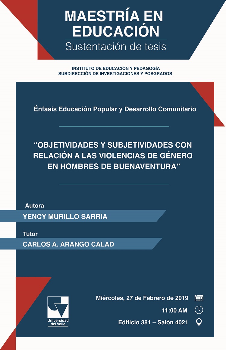 La Maestría en Educación del Instituto de Educación y Pedagogía, Énfasis en educación popular y desarrollo comunitario, invita a la sustentación del trabajo de grado "Objetividades y subjetividades con relación a las violencias de género en hombres de Buenaventura". La autora del trabajo es Yency Murillo Sarria, y el tutor es el profesor Carlos A. Arango Calad.
