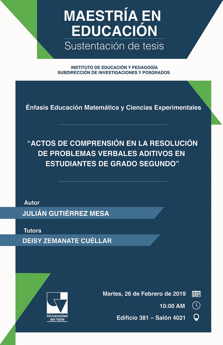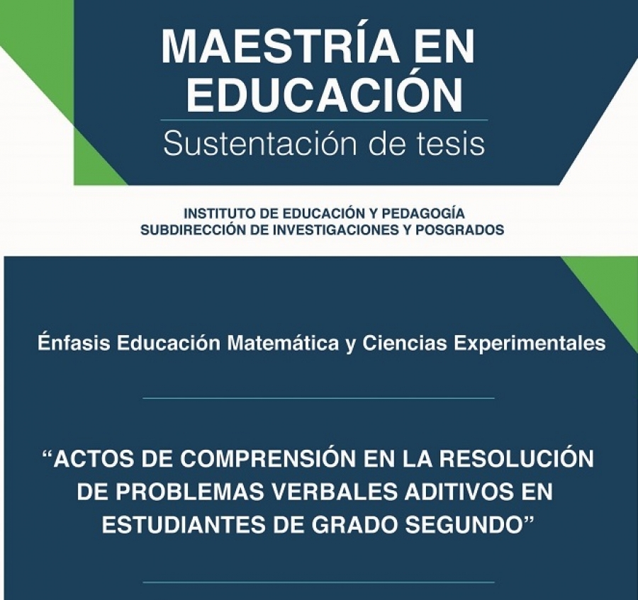 La Maestría en Educación del Instituto de Educación y Pedagogía, Énfasis en educación matemática y ciencias experimentales, invita a la sustentación del trabajo de grado "Actos de comprensión en la resolución de problemas verbales aditivos en estudiantes de segundo grado". El autor del trabajo es Julián Gutiérrez Mesa, y la tutora es la profesora Deisy Zemanate Cuéllar.