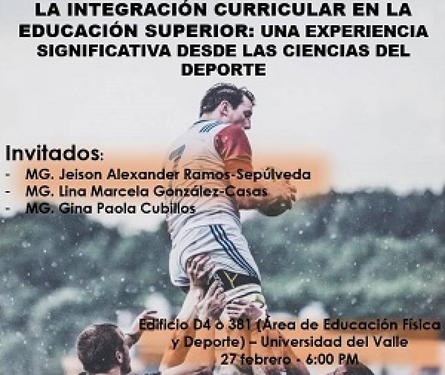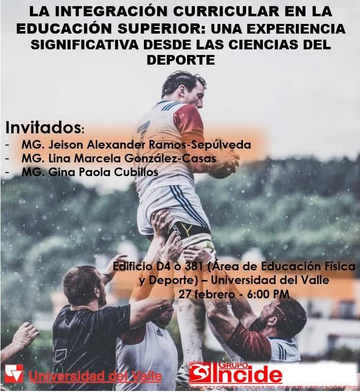 El grupo de investigación INCIDE, del Instituto de Educación y Pedagogía de la Universidad del Valle, invita a la actividad: La integración curricular en la educación superior: una experiencia significativa desde las ciencias del deporte. La actividad tendrá como invitados a los magísters Jeison Alexander Ramos, Lina Marcela González y Gina Paola Cubillos. El lugar será en el primer piso del edificio D4 (381) el 27 de febrero a las 6:00 p.m.