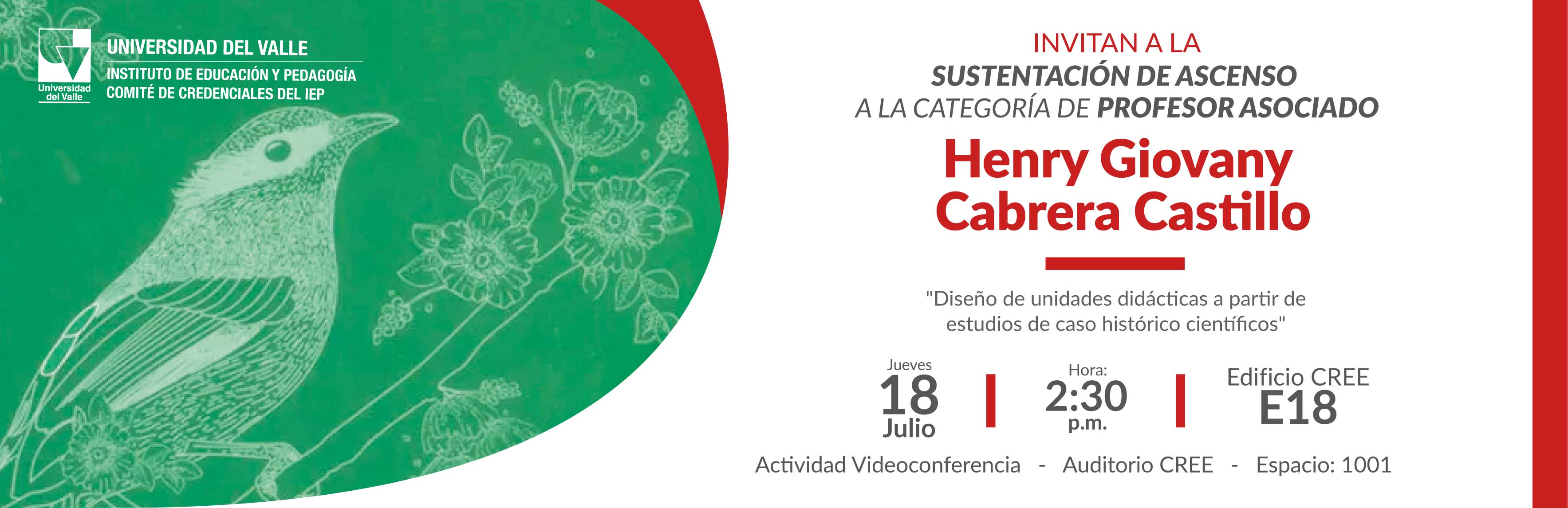 El Comité de Credenciales del Instituto de Educación y Pedagogía de la Universidad del Valle invita a la sustentación de ascenso a la categoría de Profesor Asociado de Henry Giovany Cabrera Castillo. El profesor y actual subdirector de investigaciones y posgrados del IEP expondrá el tema "Diseño de unidades didácticas a partir de estudios de caso histórico científicos". La actividad se realizará el 18 de julio a las 2:30 p.m., en el Edificio del CREE E-18.