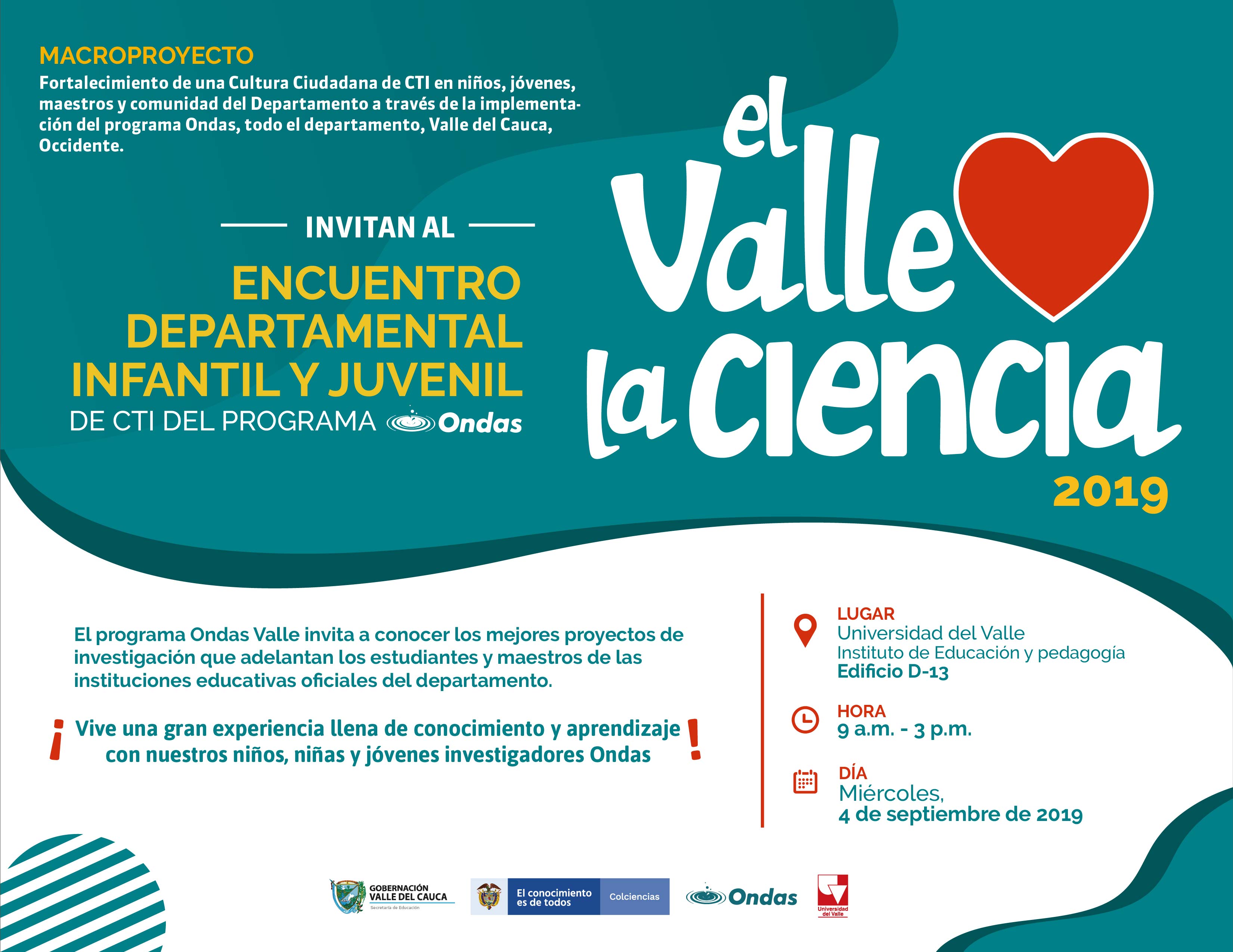 El Programa Ondas Valle invita a nuestro Encuentro Departamental Infantil y Juvenil del CTI "El Valle ama la Ciencia". Esta vez nos encontraremos en la Universidad del Valle, en el espacio externo del edificio D 13 del Instituto de Educación y Pedagogía, desde las 9:00 a.m. Están invitados profesores, estudiantes, empleados y público visitante a conocer las propuestas investigativas más interesantes de este 2019. Niños, niñas y jóvenes de todas las regiones del departamento estarán atentos a exponer sus adelantos, relatar su proceso y, especialmente, compartir su entusiasmo por la investigación y el conocimiento.