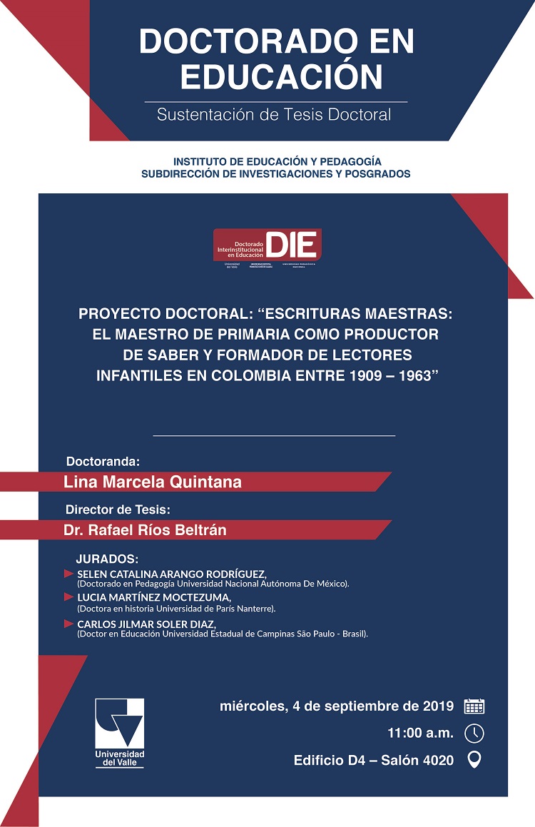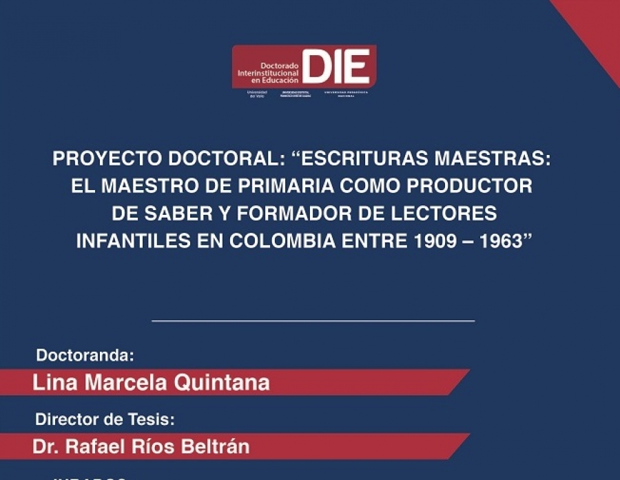 El Doctorado Interinstitucional en Educación invita a la sustentación del proyecto doctoral: “Escrituras Maestras: El maestro de primaria como productor de saber y formador de lectores infantiles en Colombia entre 1909 – 1963” de la doctoranda Lina Marcela Quintana. El director de tesis es el profesor Rafael Ríos Beltrán. La actividad se realizará el miércoles 4 de abril a las 11:00 a.m en el edificio D4, salón 4020.
