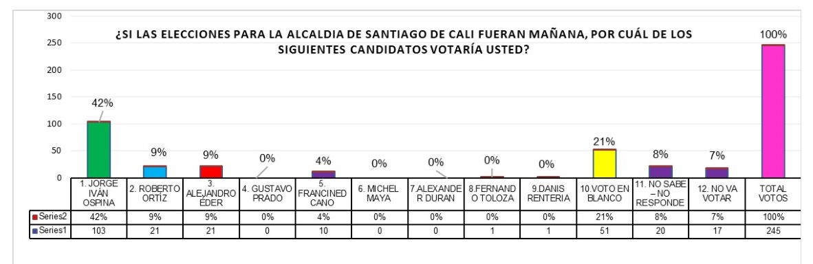 Las y los estudiantes de la “Cátedra de Formación Ciudadana y Constitución Política”, Grupo 06 de la Universidad del Valle, sede Meléndez, realizaron una encuesta a su grupo familiar con la siguiente pregunta: ¿SI LAS ELECCIONES PARA LA ALCALDÍA DE SANTIAGO DE CALI FUERAN MAÑANA, POR CUÁL DE LOS SIGUIENTES CANDIDATOS VOTARÍA USTED? La lista presentada fue la siguiente: Jorge Iván Ospina, Roberto Ortiz, Alejandro Eder, Gustavo Prado, Francined Cano, Michel Maya, Alexander Duran, Fernando Toloza, Danis Rentería, Voto en blanco, No sabe – no responde, No vota.
