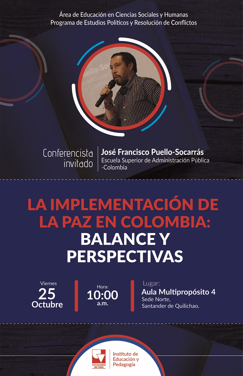 El Programa de Estudios Políticos y Resolución de Conflictos del Área de Educación en Ciencias Sociales y Humanas del Instituto de Educación y Pedagogía invitan a la conferencia "La implementación de la paz en Colombia: balance y perspectivas". El conferencista a cargo será José Francisco Puello-Socarrás, de la Escuela Superior de Administración Pública (Colombia). La actividad académica se realizará el viernes 25 de octubre, a las 10:00 a.m., en el Aula Multipropósito 4 (Sede norte, Santander de Qulichao (Cauca).
