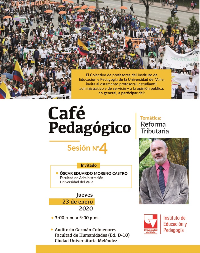 El colectivo de profesores que se han organizado en torno a la idea de Café Pedagógico invita a la sesión cuarta, con el tema Reforma tributaria. El Café es una iniciativa de un grupo de profesores del Instituto de Educación y Pedagogía y tiene como objetivo instalar un espacio de información, reflexión y discusión alrededor de temas concretos y relacionados directamente con el paro nacional que inició el pasado 21 de noviembre. La actividad se realizará el jueves 23 de enero de 2019, de 3:00 p.m. a 5:00 p.m., en el Auditorio Germán Colmenares.