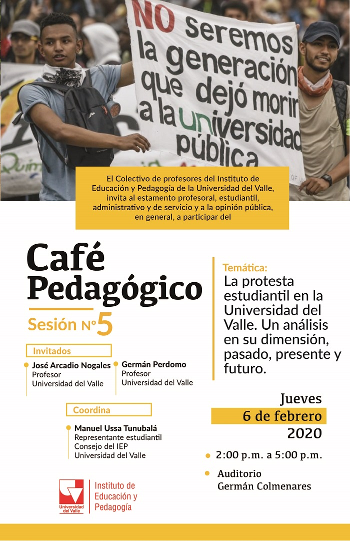 El colectivo de profesores que se han organizado en torno a la idea de Café Pedagógico invita a la sesión quinta, con el tema La protesta estudiantil en la Universidad del Valle. Un análisis en su dimensión pasado, presente y futuro. El Café es una iniciativa de un grupo de profesores del Instituto de Educación y Pedagogía y tiene como objetivo instalar un espacio de información, reflexión y discusión alrededor de temas concretos y relacionados directamente con el paro nacional que inició el pasado 21 de noviembre. Para esta sesión los invitados son los profesores José Arcadio Nogales y Germán Perdomo. La actividad se realizará el jueves 6 de febrero de 2019, de 2:00 p.m. a 5:00 p.m., en el Auditorio Germán Colmenares.