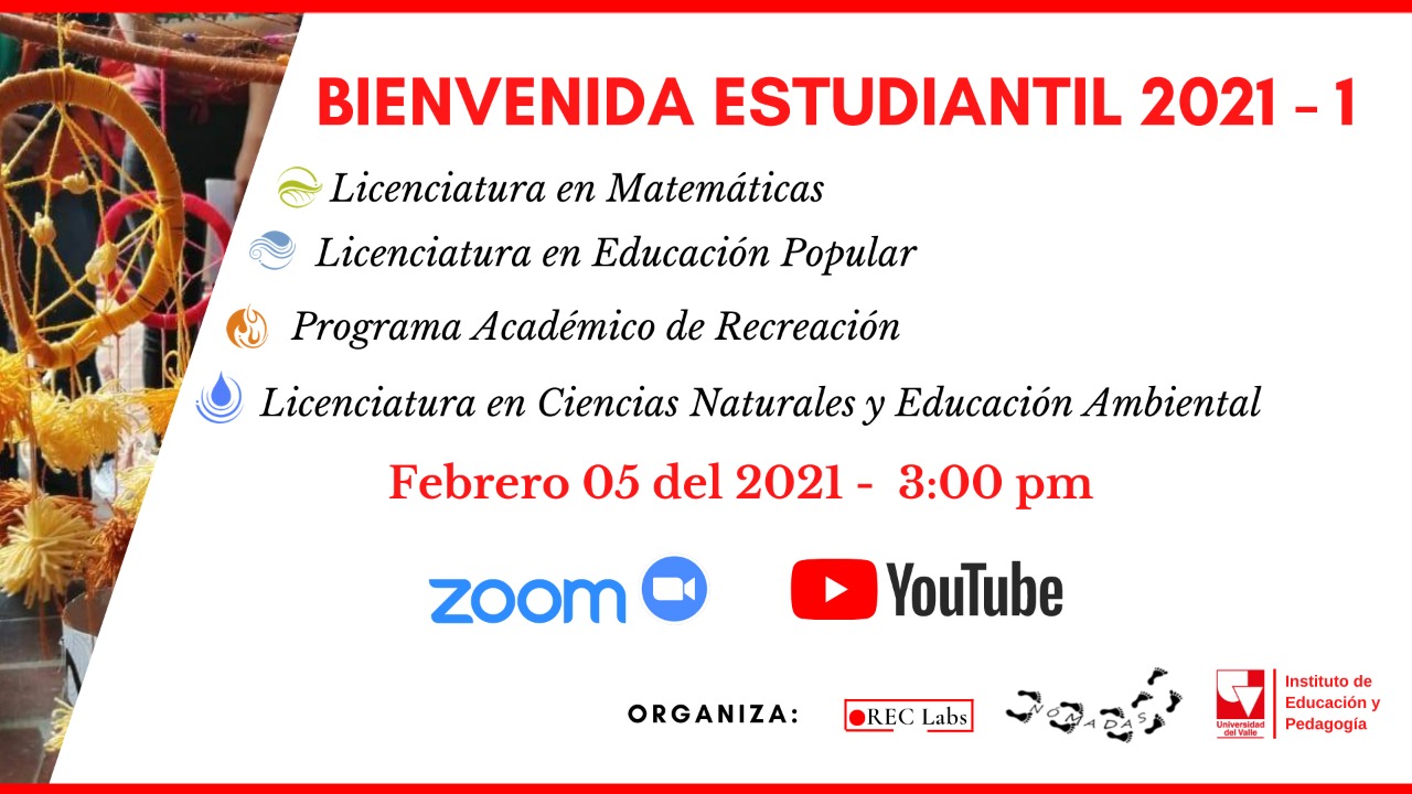 Este viernes 5 de febrero se realizará la bienvenida a los estudiantes de primer semestre de los Programas de Licenciatura en Matemáticas, Educación Popular, Ciencias Naturales y Educación Ambiental y el Programa Académico de Recreación. Junto a los saludos por parte del director del IEP y de los directores de programa, el grupo Nómadas del Programa de Recreación realizará una actividad con cada grupo. La actividad se realizará vía zoom.