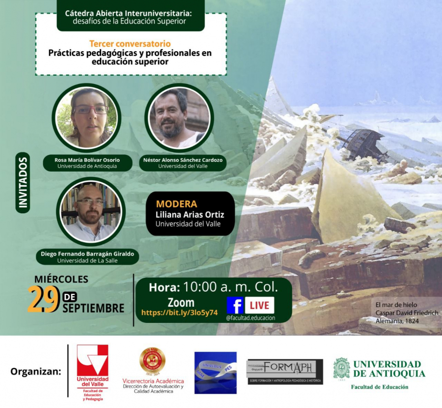 El Grupo de investigación UNIVEDUS de la Facultad de Educación y Pedagogía y el Grupo de investigación FORMAPH de la Facultad de Educación de la Facultad de Educación de la Universidad de Antioquia, invitan cordialmente a la Cátedra abierta interuniversitaria: desafíos de la educación superior, en su tercer encuentro "Prácticas pedagógicas y profesionales en educación superior". La actividad se realizará el 29 de septiembre a las 10:00 a.m. El enlace de transmisión es https://bit.ly/2ZoWx6B