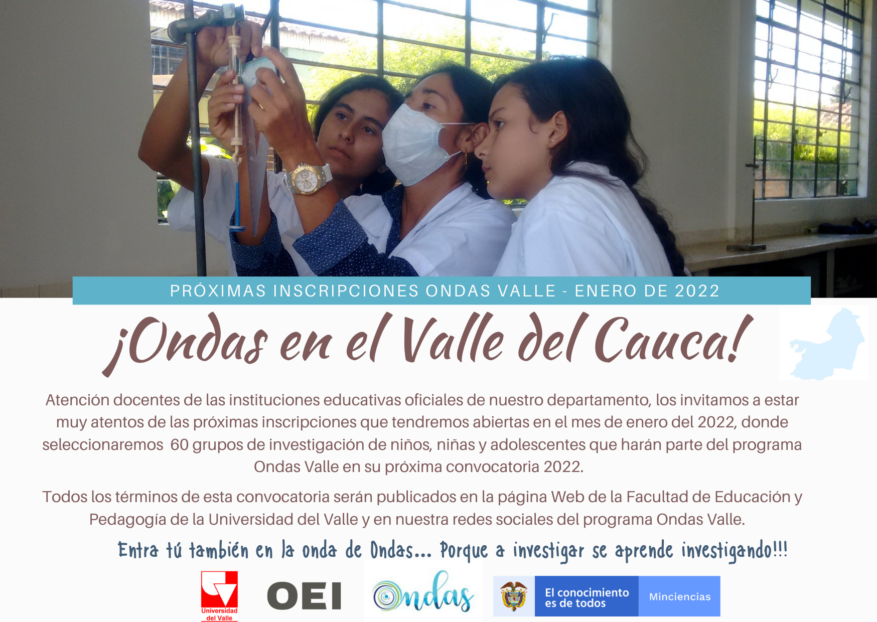 El Programa Ondas Valle del Cauca invita a los docentes de las instituciones educativas oficiales del departamento a estar atentos a las próximas inscripciones a la convocatoria 2022 del Programa. Se seleccionarán 60 grupos de niños, niñas y adolescente. Todos los términos de esta convocatoria serán publicados en esta página web y en las redes sociales del Programa Ondas.