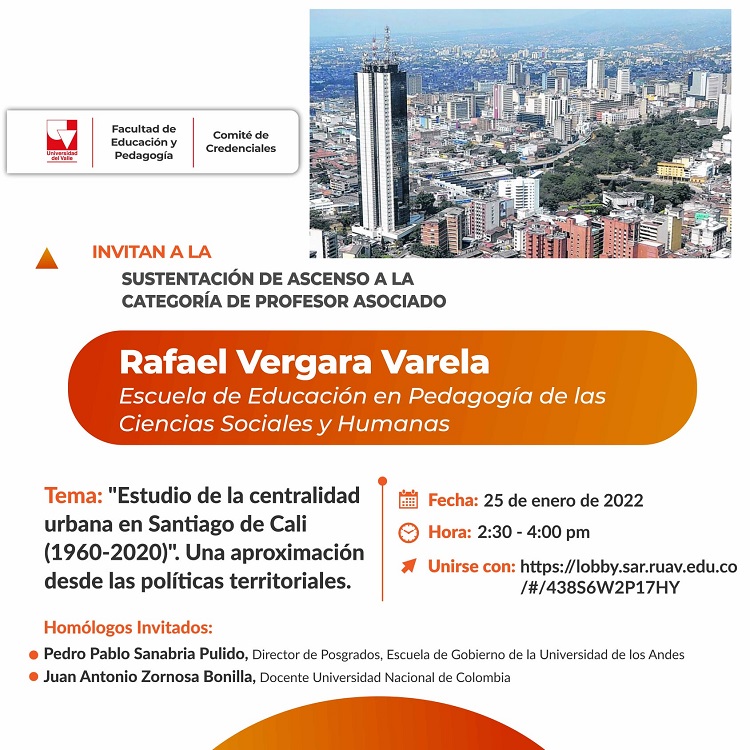 La Oficina de Credenciales de la Facultad de Educación y Pedagogía invita a la sustentación de ascenso a la categoría de profesor asociado de Rafael Vergara Varela, profesor de la Escuela de Educación en Pedagogía de las Ciencias Sociales y Humanas. El tema a presentar es ""Estudio de la centralidad urbana en Santiago de Cali (1960-2020)". Una aproximación desde las políticas territoriales". La actividad académica se realizará el 25 de enero de 2022 a las 2:30 p.m. El link es https://lobby.sar.ruav.edu.co/#/438S6W2P17HY