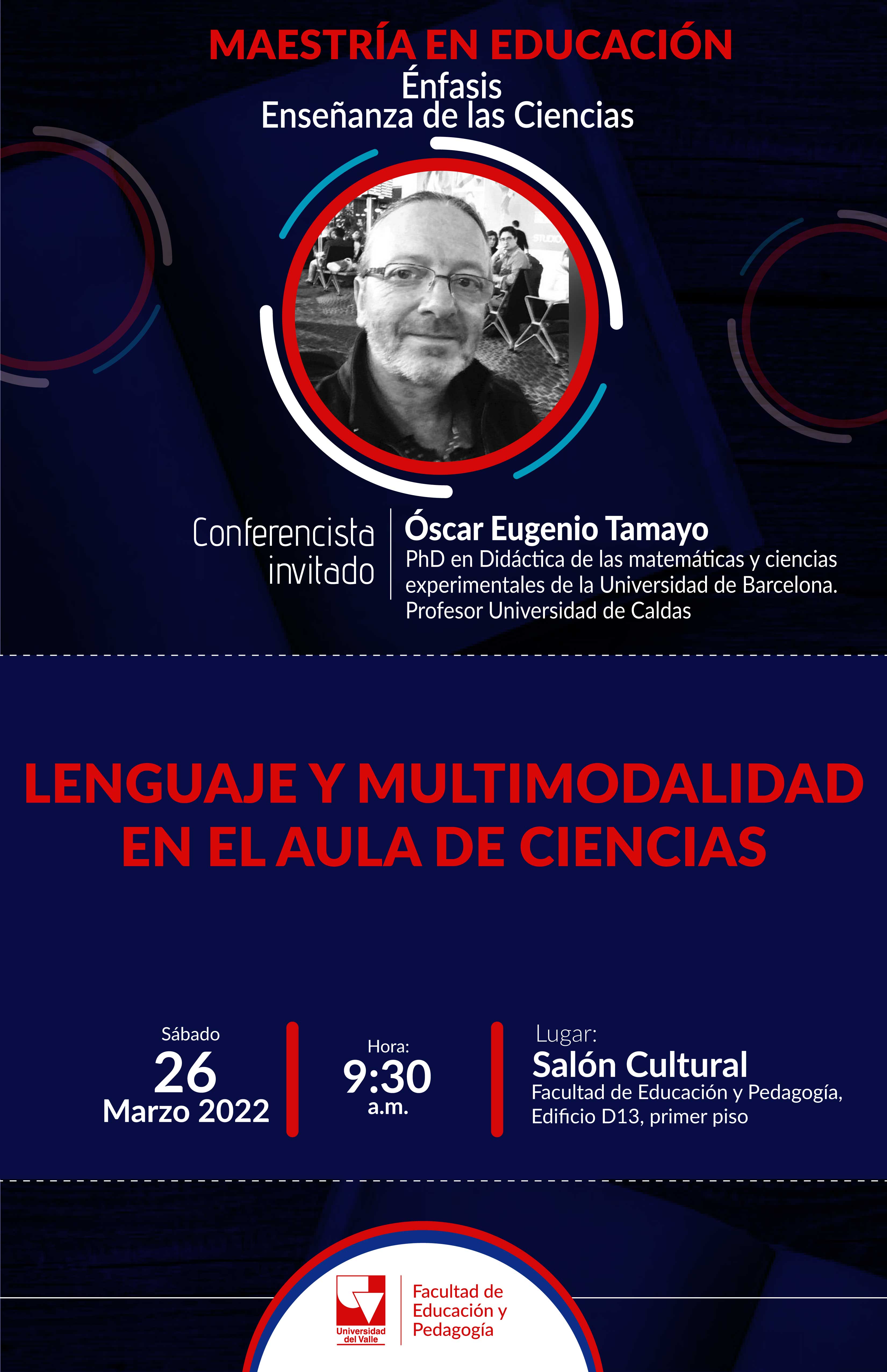 El sábado 26 de marzo a las 9:30 a.m., el énfasis en Enseñanza de las Ciencias de la Maestría en Educación de la Facultad de Educación y Pedagogía tendrá su conferencia inaugural. El profesor Óscar Eugenio Tamayo presentará la conferencia "Lenguaje y multimodalidad en el aula de ciencias".