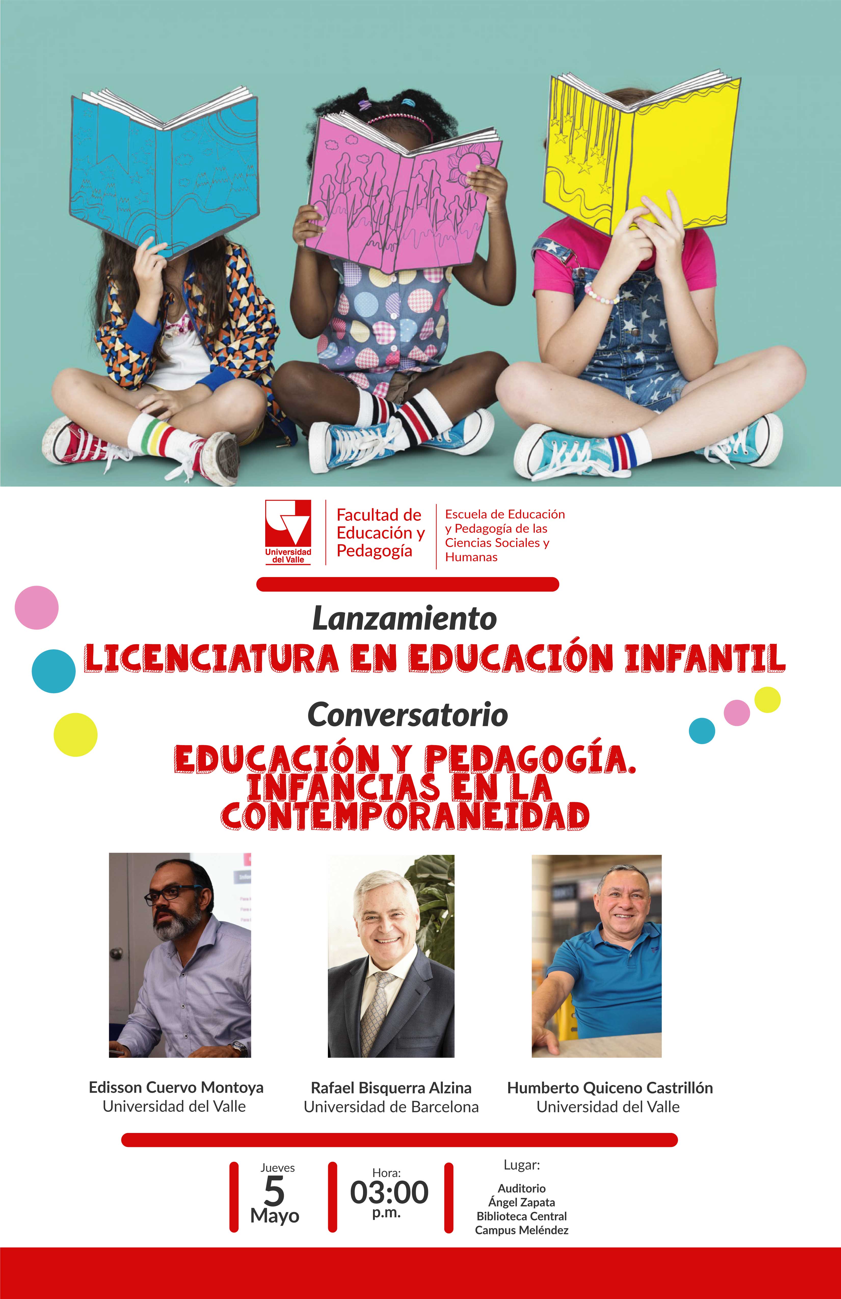La Escuela de Educación y Pedagogía de las Ciencias Sociales y Humanas de la Facultad de Educación y Pedagogía de la Universidad del Valle invita a la presentación y lanzamiento académico de la nueva Licenciatura en Educación Infantil, actualmente abierta a interesados e interesadas para el semestre 2022-II. Y en el marco de esta actividad, se tendrá el conversatorio "Educación y pedagogía. Infancias en la contemporaneidad” contando como invitados a los profesores Rafael Bisquerra Alzina (Universidad de Barcelona) y Humberto Quiceno (Universidad del Valle) y moderación del profesor Edisson Cuervo Montoya (FEP- Universidad del Valle). La jornada académica se realizará el jueves 5 de mayo, desde la 3:00 p.m. en el Auditorio Ángel Zapata, anexo a la Biblioteca Central Mario Carvajal (sede Meléndez). Están cordialmente invitados.