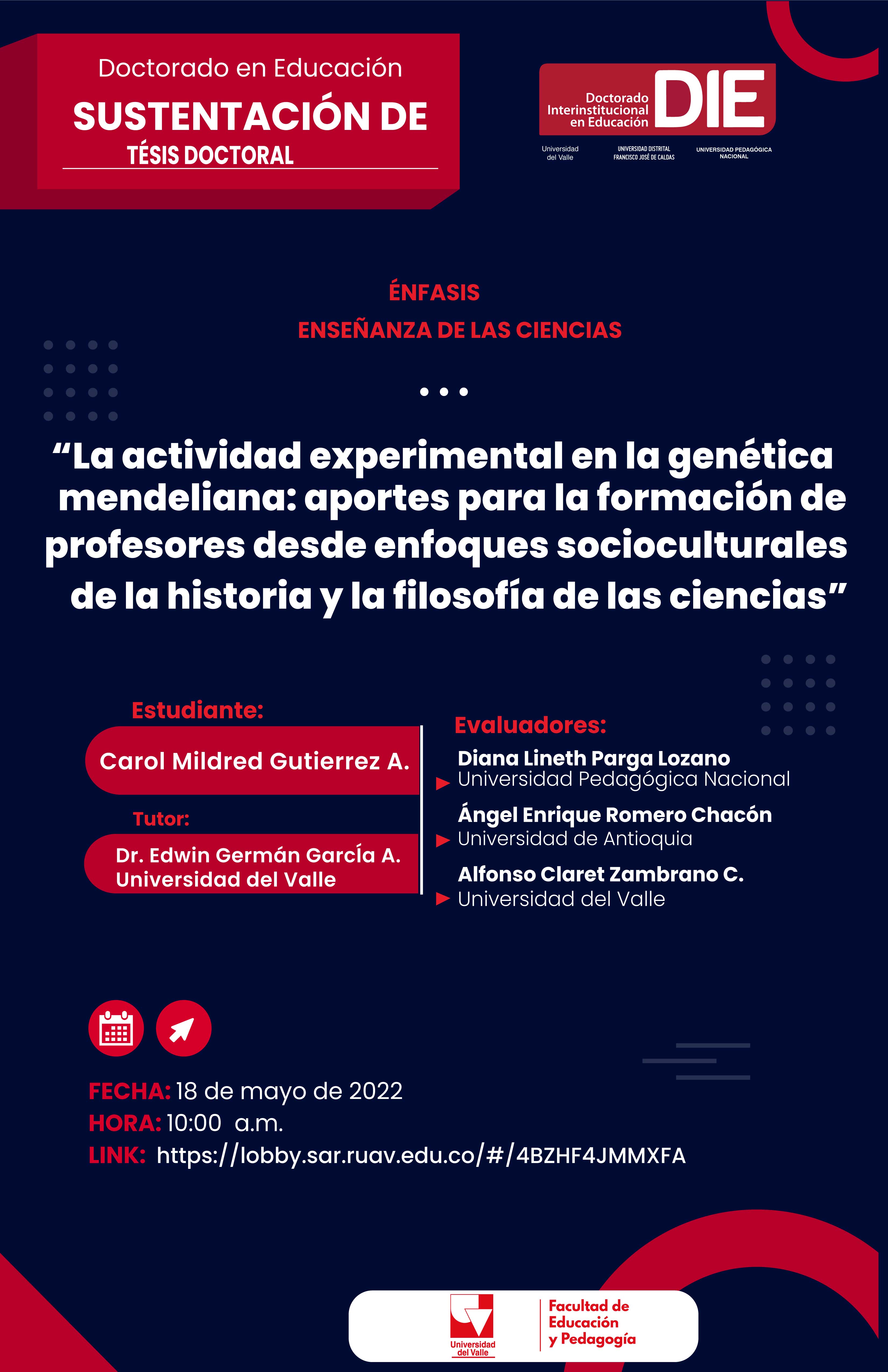El Doctorado Interinstitucional en Educación, énfasis en Enseñanza de las Ciencias, invita a la sustentación de la tesis doctoral "La actividad experimental en la genética mendeliana: aportes para la formación de profesores desde enfoques socioculturales de la historia y la filosofía de las ciencias" de la estudiante Carol Mildred Gutiérrez Avendaño. La actividad académica se realizará el 18 de mayo, a las 10:00 a.m. Enlace Zoom: