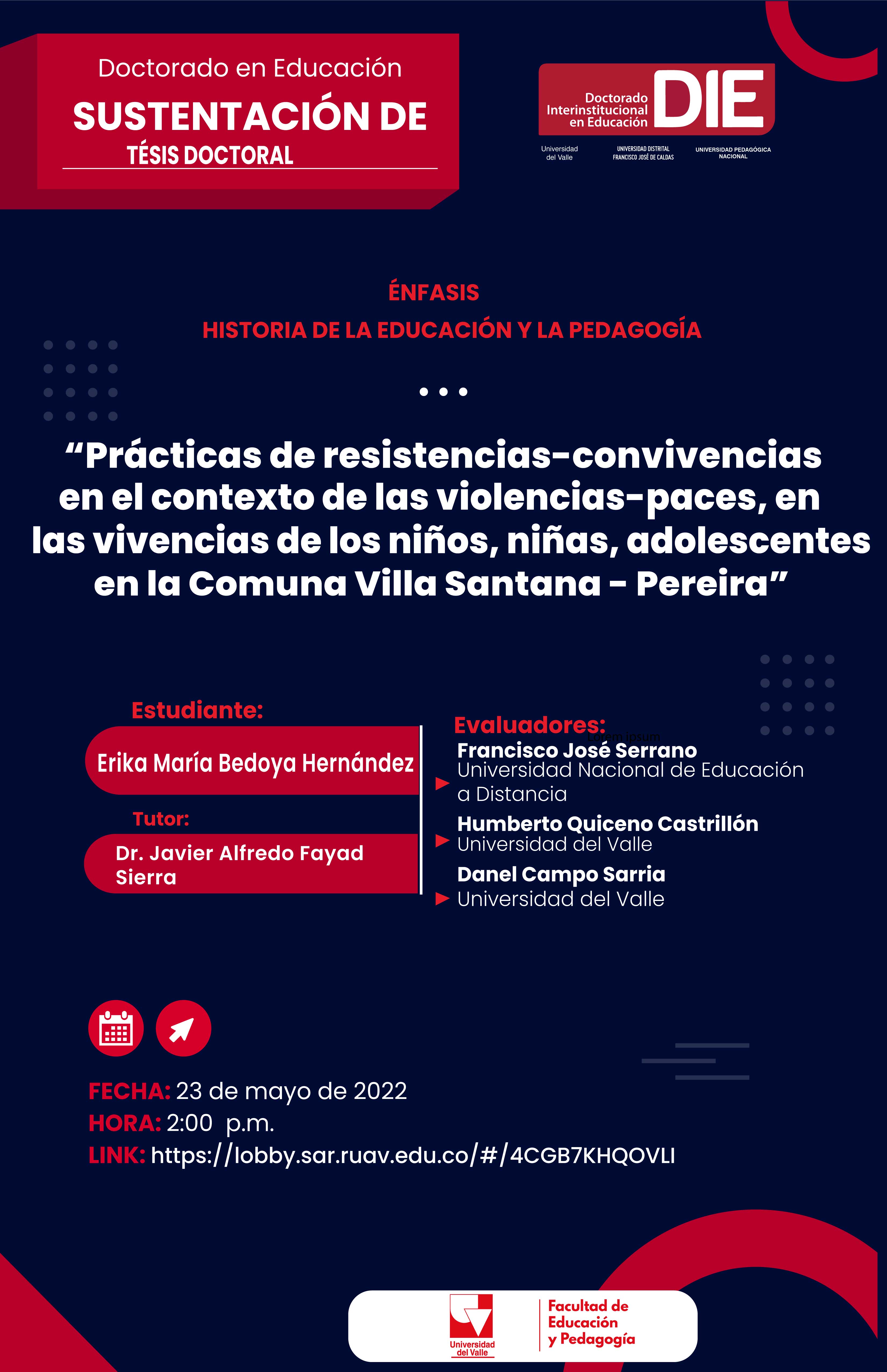 El Doctorado Interinstitucional en Educación, énfasis en Historia de la Educación y la Pedagogía invita a la sustentación de la tesis doctoral "Prácticas de resistencias-convivencias en el contexto de las violencias-paces, en las vivencias de los niños, niñas, adolescentes en la Comuna Villa Santana - Pereira" de la estudiante Erika María Bedoya Hernández. La actividad académica se realizará el Lunes, 23 de mayo, a las 2:00 p.m. Enlace zoom: https://lobby.sar.ruav.edu.co/#/4CGB7KHQOVLI