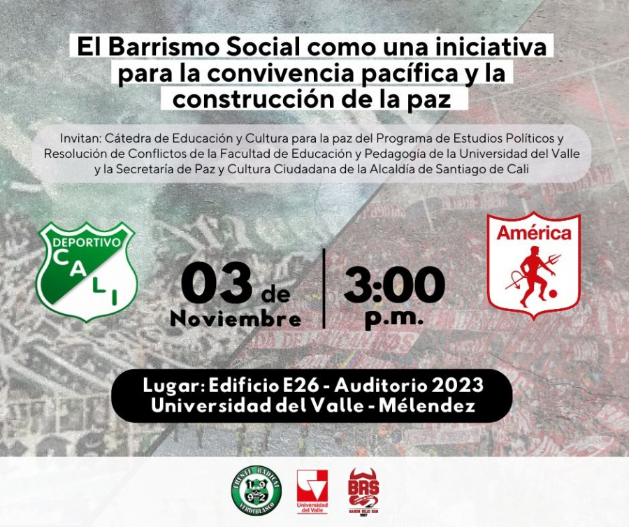 #Prográmate el jueves 3 de noviembre a las 3:00 p.m. con el conversatorio "El barrismo social como una iniciativa para la convivencia pacífica y la construcción de la paz". Esta actividad se realizará en el edificio E6 - aula 1021 en el campus Meléndez de la Universidad del Valle