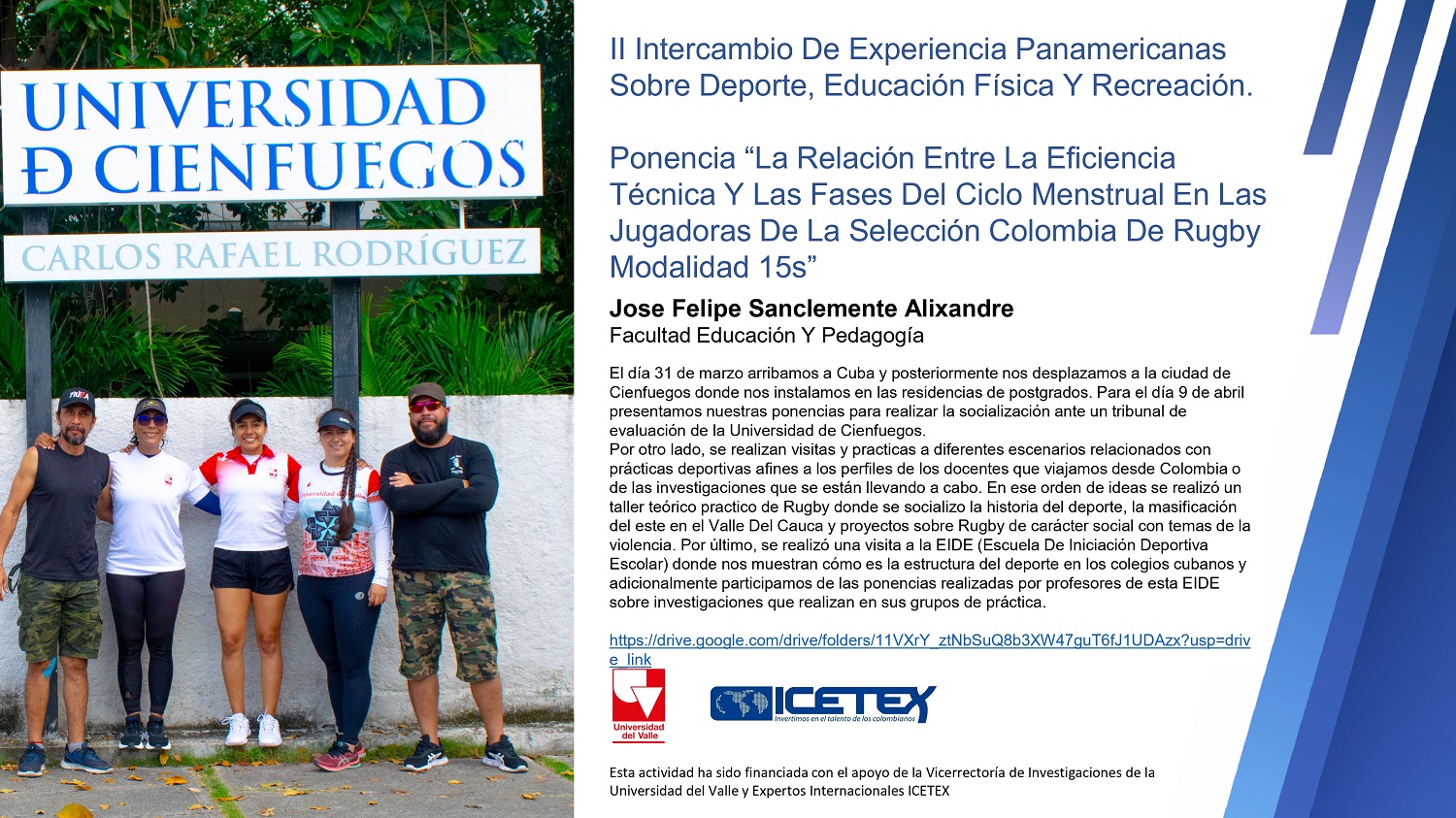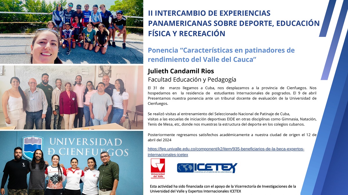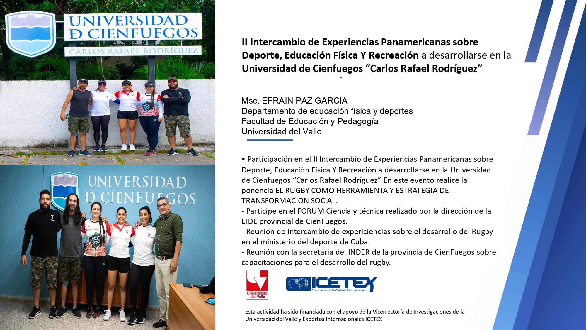 Los estudiantes Felipe Sanclemente, Dora Ramírez, Julieth Candamil y Daniela Ramírez, del énfasis Pedagogía del Entrenamiento Deportivo, de la maestría en Educación, y el docente Efraín Paz; representaron a la Universidad del Valle en el II Intercambio de Experiencias Panamericanas sobre Deporte, Educación Física y Recreación, realizado en la Universidad de Cienfuegos, Cuba, durante los días 31 de marzo al 12 de abril, el cual es un evento que reúne expertos de las diferentes disciplinas deportivas a nivel internacional, para discutir alrededor de tópicos como la salud, la violencia, la educación, el género, entre otros.