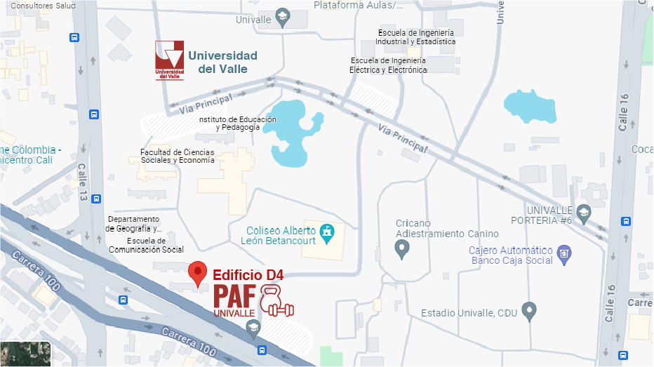 El Programa de Acondicionamiento Físico (PAF) se encuentran en las instalaciones de la Universidad del Valle en la ciudad de Cali - sede principal de Meléndez. Edificio D4 (espacios 1011 y 1013). El edificio D4 se encuentra a mano izquierda de la portería peatonal y de motos por el ingreso de la carrera 100, en frente de las oficinas del ICETEX.